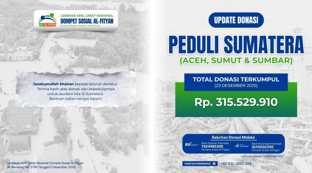Jakarta, 23 Desember 2025 – Bismillahirrahmanirrahim. Dengan penuh syukur, Dompet Sosial Al-Fityan menyampaikan perkembangan terkini penggalangan dana untuk korban bencana di Sumatera hingga tanggal 23 Desember 2025. Total donasi yang telah terkumpul dari kepedulian masyarakat Indonesia adalah Rp 315.529.910 (Tiga ratus lima belas juta lima ratus dua puluh sembilan ribu sembilan ratus sepuluh rupiah). Angka ini bukan sekadar […]