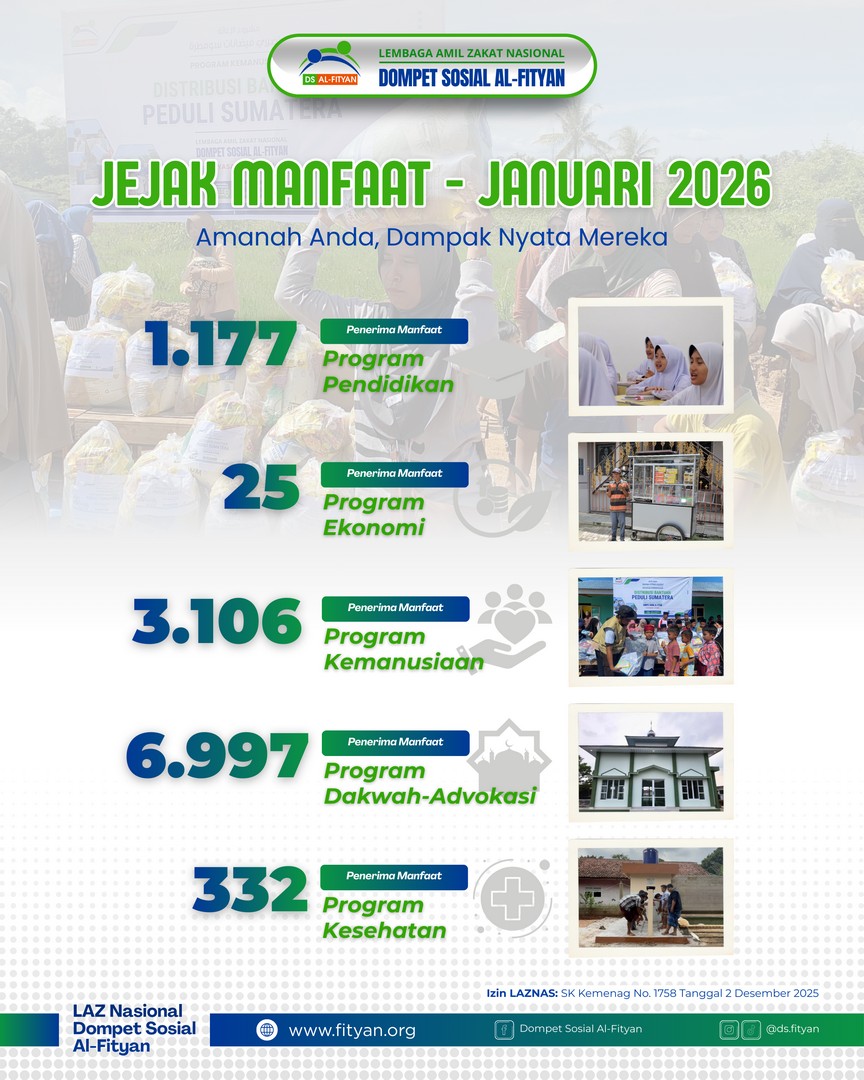 Angka di atas bukan sekadar statistik, melainkan simbol harapan bagi ribuan kepala keluarga, pelajar, hingga para lansia. Dompet Sosial Al-Fityan mengucapkan terima kasih yang mendalam kepada seluruh donatur yang terus memercayakan zakat dan donasinya kepada kami.